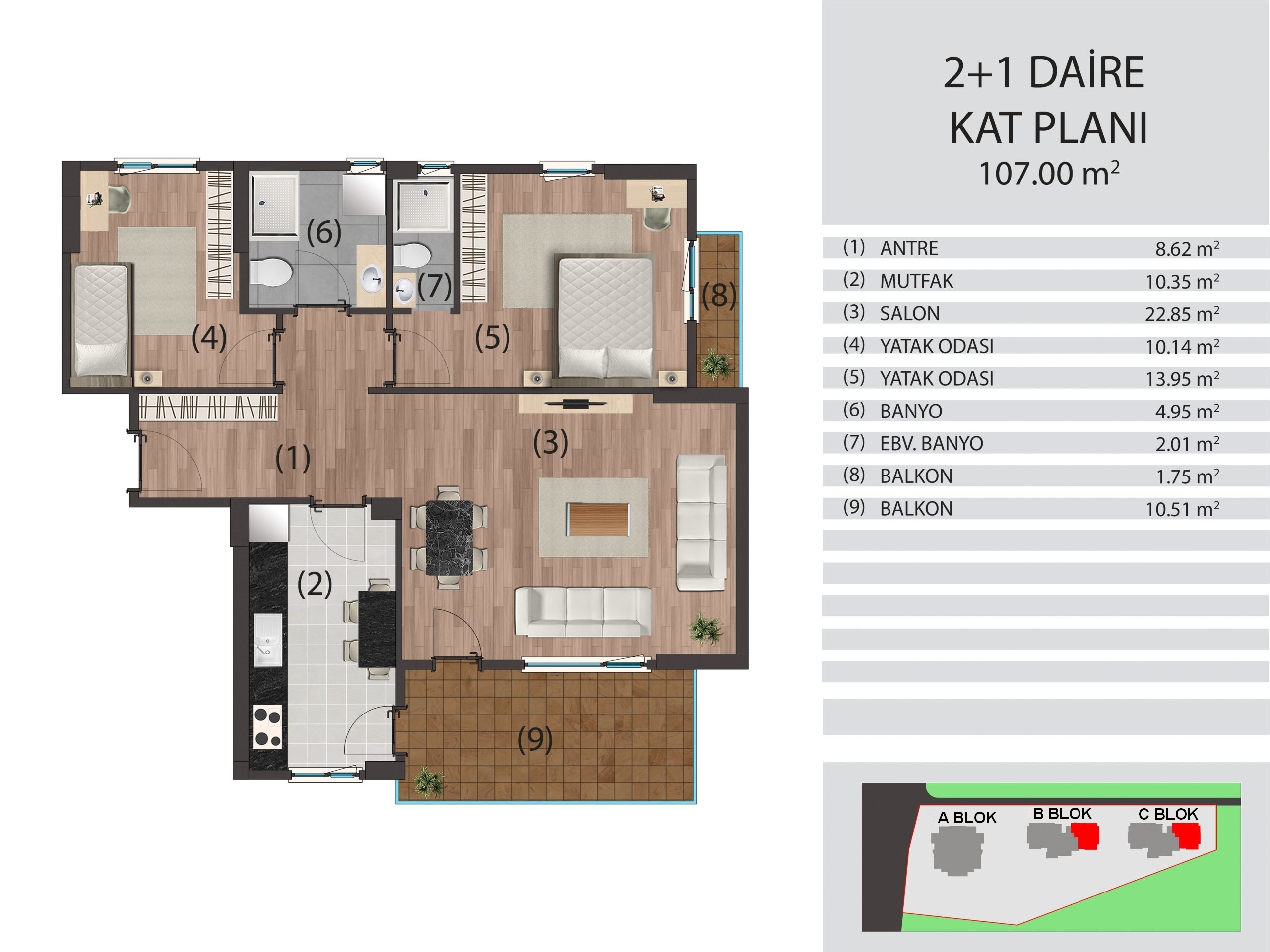 2 yatak odası, 1 salon, 1 mutfak, 1 banyo ve 1 ebeveyn banyodan oluşan bu daire, geniş ve ferah bir yaşam alanı sunuyor. Manzaraya bakan büyük balkon ve ek bir küçük balkon, açık havada keyifli vakit geçirmeniz için ideal. Geniş giriş koridoru sayesinde dairenize girer girmez ferah bir atmosfer hissedeceksiniz. Alan kaybı minimumda tutularak her metrekare verimli bir şekilde kullanılmış. Bu daire, konforlu ve modern bir yaşam tarzı arayanlar için mükemmel bir seçim.
